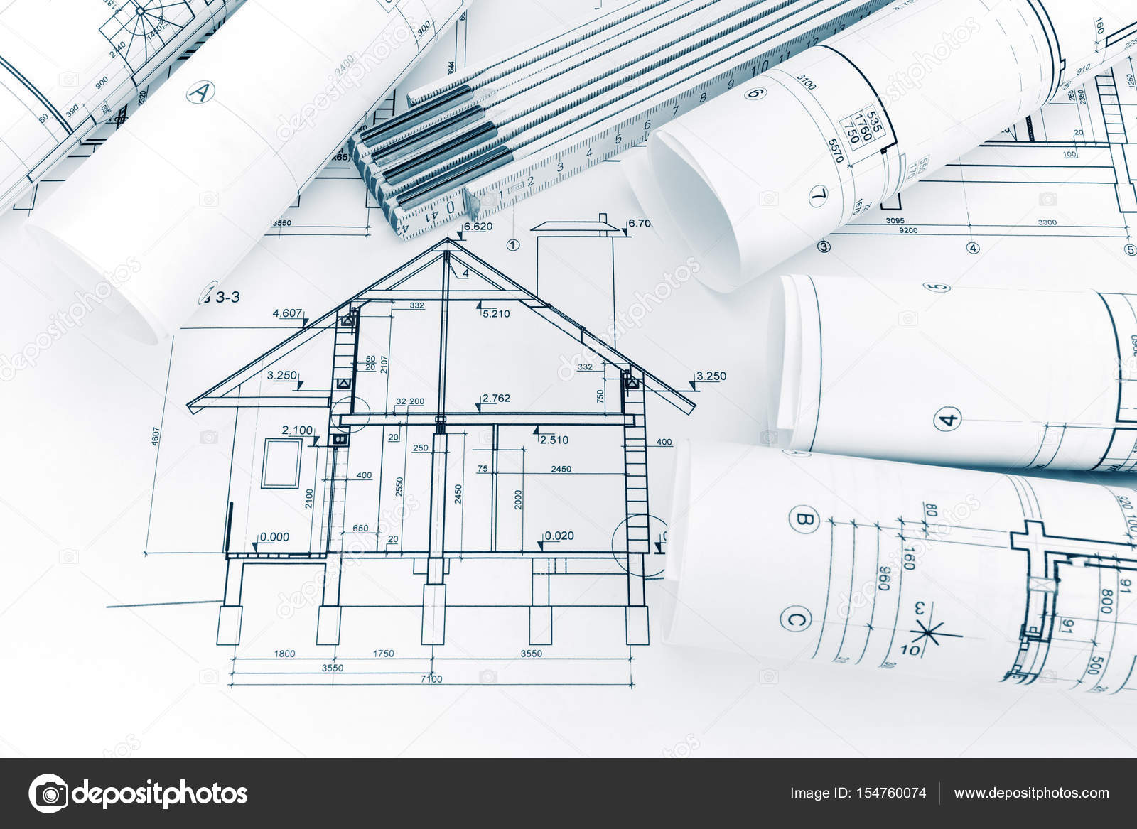 Part Of Architectural Project And House Plan Blueprints Rolled